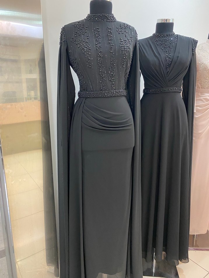 Uzun Siyah Gotik Nakışlı Abiye Elbise