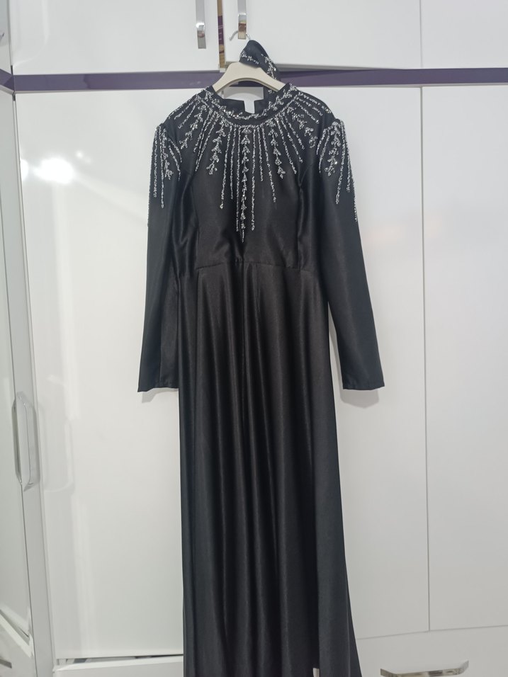 Uzun siyah abiye elbise, yüksek yakalı ve uzun kollu, incelikle işlenmiş boncuk ve nakış detaylarıyla klasik gotik şıklık sunar kemer dahil