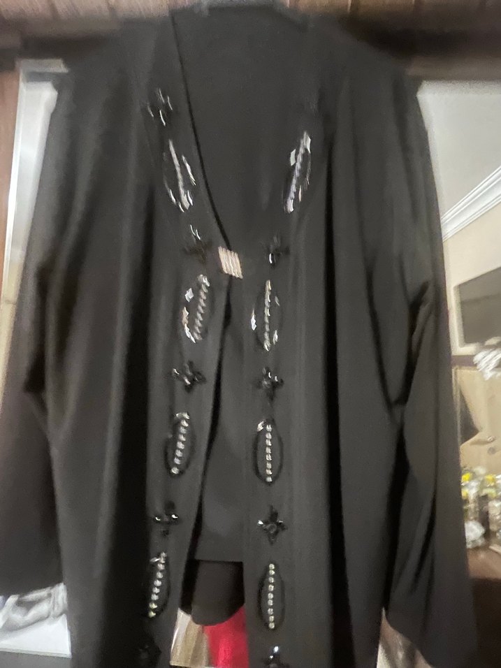 Uzun siyah ceket, düğmeli ön ve yakalı. İpek gibi kumaş üzerine nakış detaylı, regular fit ve uzun kollu. Ofis için uygun.