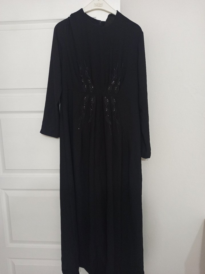 Yüksek yakalı ve uzun kollu, nakış detaylı uzun siyah elbise. Sentetik kumaştan, bol kesimli ve drapeli, modest gotik tarzda. Romantik akşamlar için uygun.