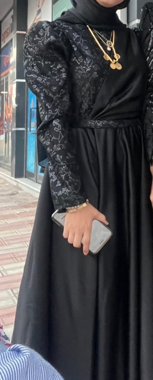 Dar kesim, uzun siyah abiye elbise, yüksek yakalı ve uzun kollu, nakışlı desenlere sahip. Drapeli tasarımı ile gotik ve modest tarzda düğünler için uygun. ✨