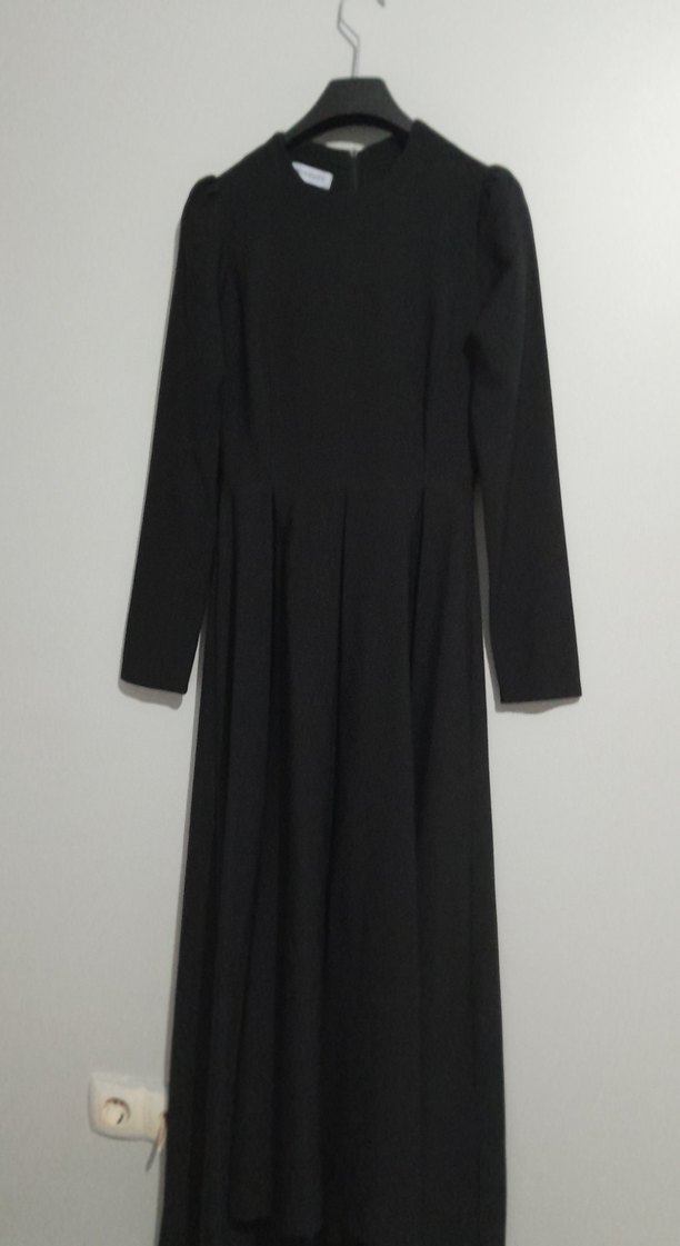 Uzun siyah elbise, yüksek yaka ve uzun kollu tasarıma sahiptir. Pilili detayları ile sade bir doku sunar. Sentetik kumaştan yapılmıştır ve klasik zarafet için uygundur.boy uzunluğu 122 ön kısmın kuyruğu arkandan uzunlukta 142 iki kol arasi 40cm