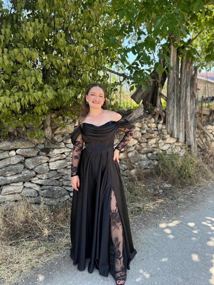 Uzun siyah gotik abiye elbise, straplez drapeli yaka ve uzun dantel kollara sahiptir. Bol kesim ve yırtmaçlıdır, düğün ve özel davetler için uygundur.