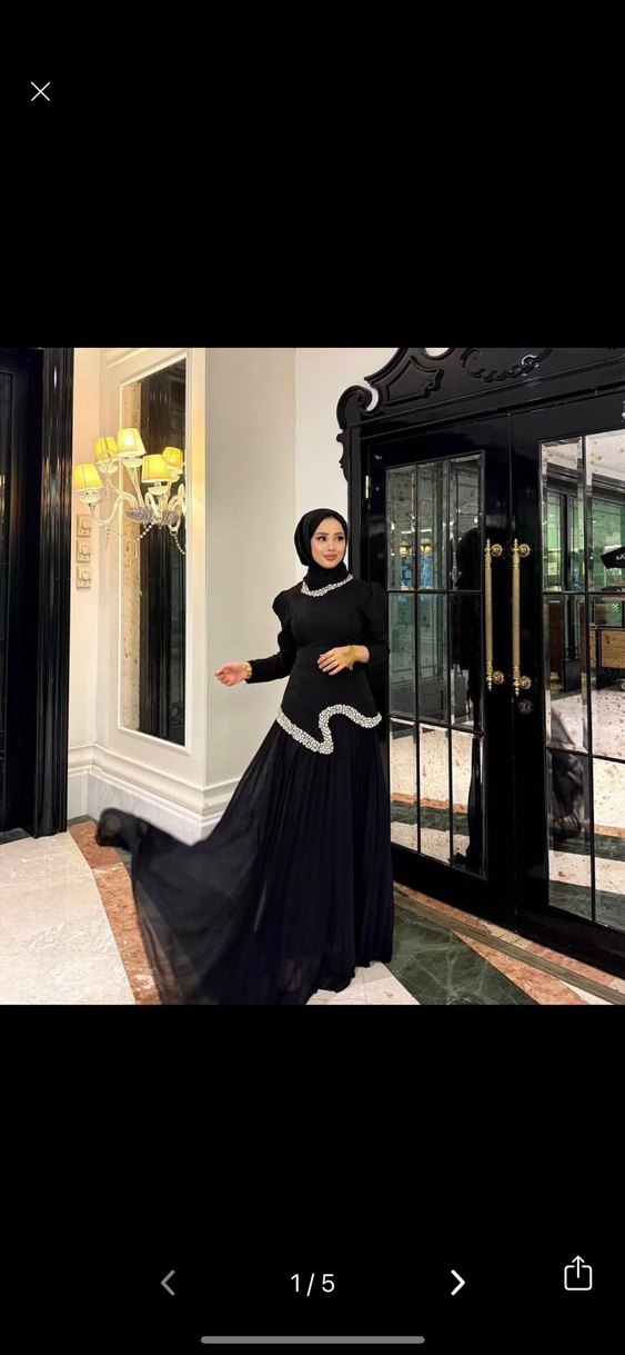 Uzun siyah abiye elbise, yüksek yakalı ve uzun kolludur. Etnik desenli drapeler bel ve göğüs kısmında yer alır. Tesettür ve düğünler için uygundur. Yeni defosuz XXL /44