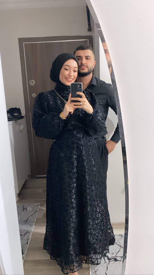 Uzun siyah gotik nişan elbisesi, yüksek yakalı ve uzun kollu, şeffaf etnik desenli, tesettürlü ve romantik bir görünüm sunar.