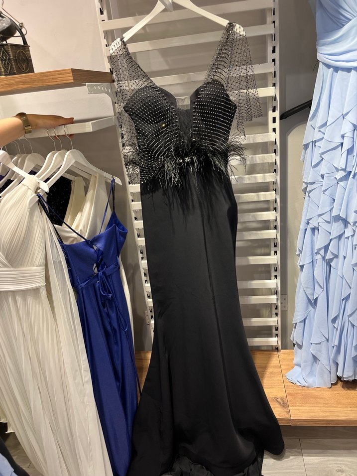 V yaka ve askılı, dökümlü ve desenli detaylara sahip siyah, vücuda oturan gotik abiye elbise. Parti için uygun. 38/40