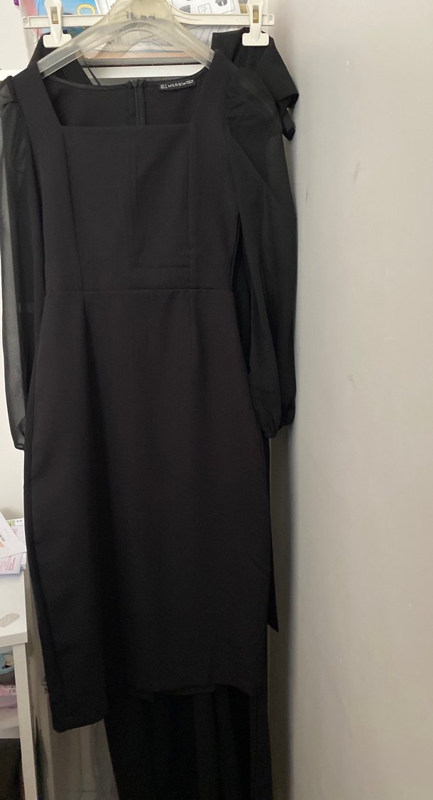 Uzun siyah elbise, V yaka ve uzun kolları drapeli detaylarla tamamlanmıştır. Düz ve sentetik kumaştan, ofis için uygun gotik tarzda bir modeldir.