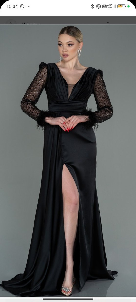Bu siyah uzun elbise, drapeli V yakası ve tüy detaylı şeffaf uzun kollarıyla dikkat çekiyor. Gotik ve cesur tasarımıyla parti için uygun.