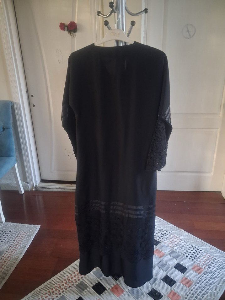 Siyah uzun elbise, drapeli ve V yakalı, uzun kollu, modest ve regular kesimdir. Ofis için uygun, desen içermeyen sentetik kumaştan yapılmıştır.