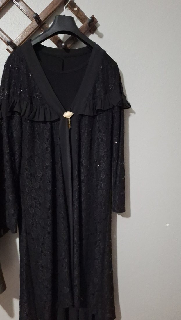 Uzun siyah gotik elbise, V yaka ve fırfırlı detaylara sahiptir. Desenli sentetik kumaştan, uzun kollu ve klasik zarif tarzdadır.
