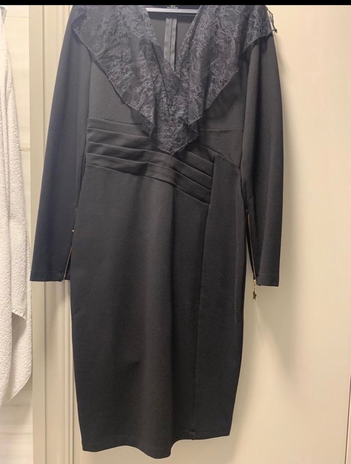 Uzun siyah, v yaka ve drapeli, uzun kollu, klasik gotik şıklığı yansıtan kadın elbisesi. Ofis için uygun, düz ve dar kesim.