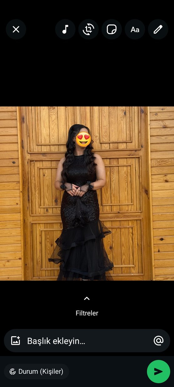 Dar kesim siyah elbise, yüksek yakalı ve askılı kollu. Yılan desenli ve volanlı etek ucu ile cesur parti tarzına uygun.Eldiven de dahil