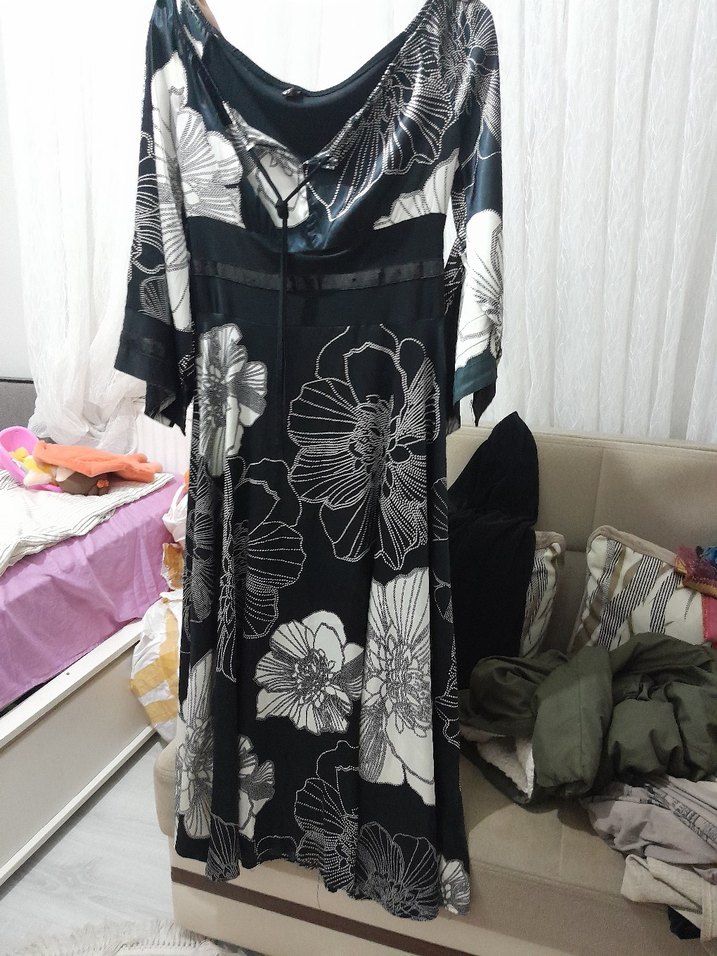 Uzun, bol kesim elbise straplez yaka ve drapeli tasarıma sahiptir. Siyah ve gri çiçek desenli, çağdaş bohem tarzda, günlük kullanım için uygundur.