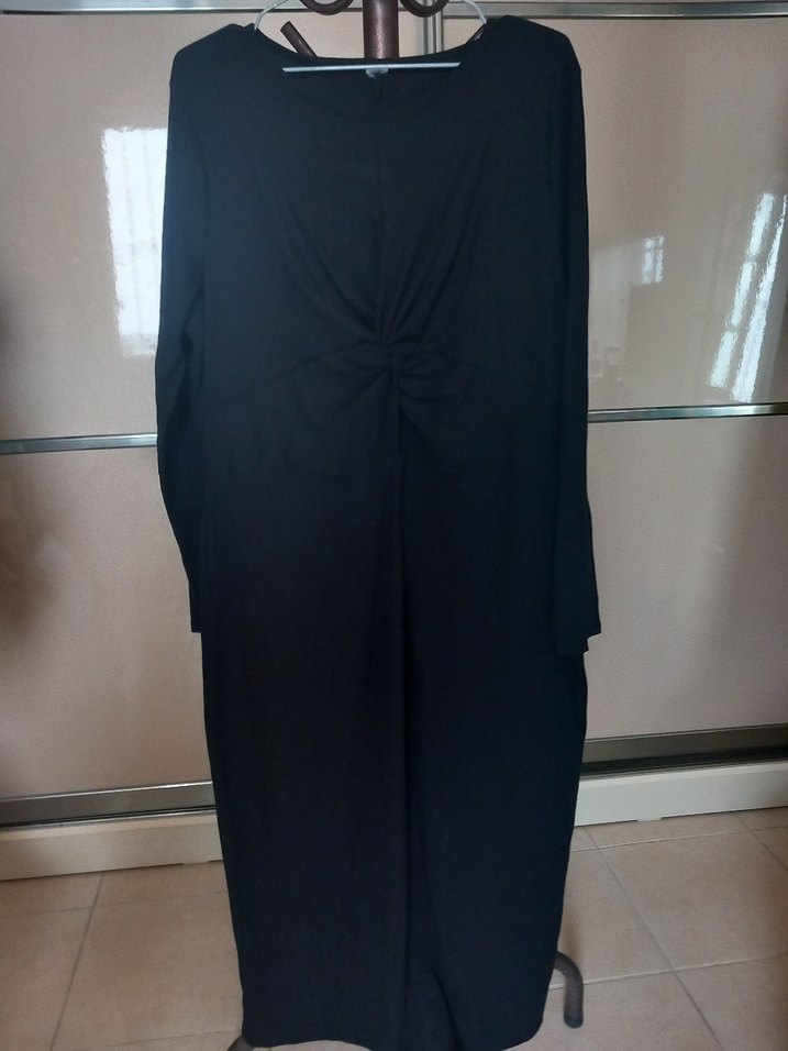 Uzun siyah hamile elbise, v-yaka ve uzun kollu, vücuda oturan kesimde, dökümlü detaylı. Ofis için uygun, yumuşak sentetik kumaştan yapılmış goth tarzı. Göbek dekolteli