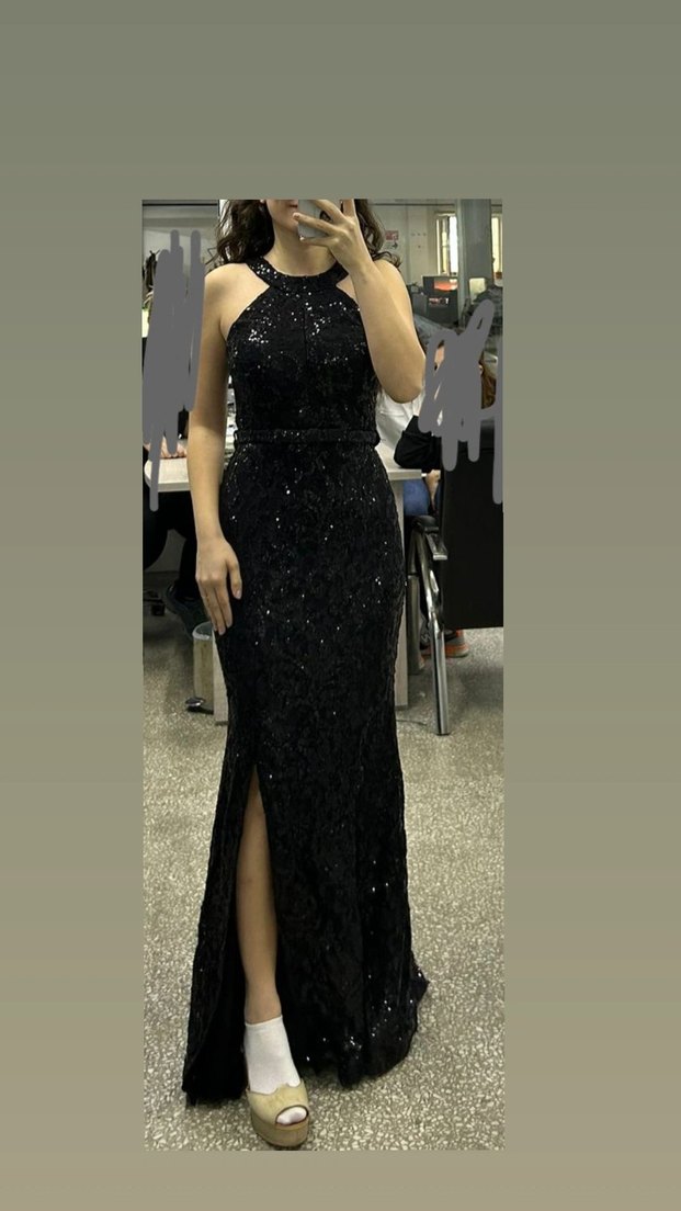 Uzun, siyah, işlemeli ve desenli, yüksek yakalı, ince askılı, sıkı kesim kadın abiye elbisesi. Cesur ve gösterişli bir tarz için uygundur.