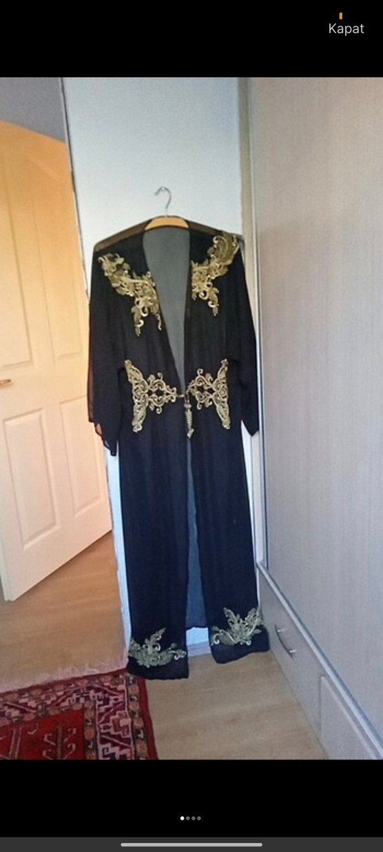 Bu uzun siyah elbise, dökümlü ve bol kesimdir. Notlu yaka ve uzun kolludur. İpek gibi kumaştan olup, altın işlemelerle bohem gotik tarzı yansıtır, düğün için uygundur. ✨