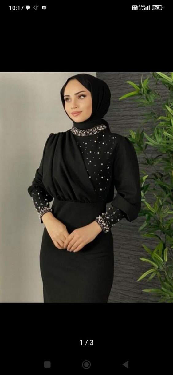 Uzun siyah elbise, yüksek yakalı ve uzun kollu, zarif işlemelerle süslenmiştir. Drapeli tasarımıyla modern ve mütevazı bir görünüm sunar. 1 kez giyildi