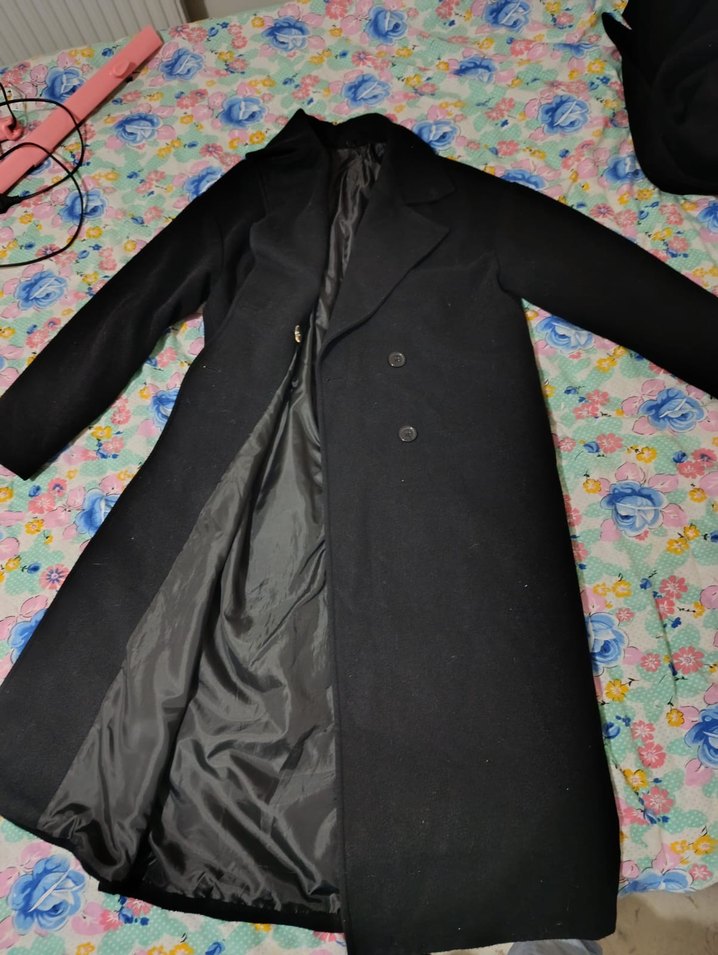 Uzun siyah kaban, çift düğmeli ön kısmı ve pürüzsüz iç astarıyla klasik ve şık bir görünüm sunar.
