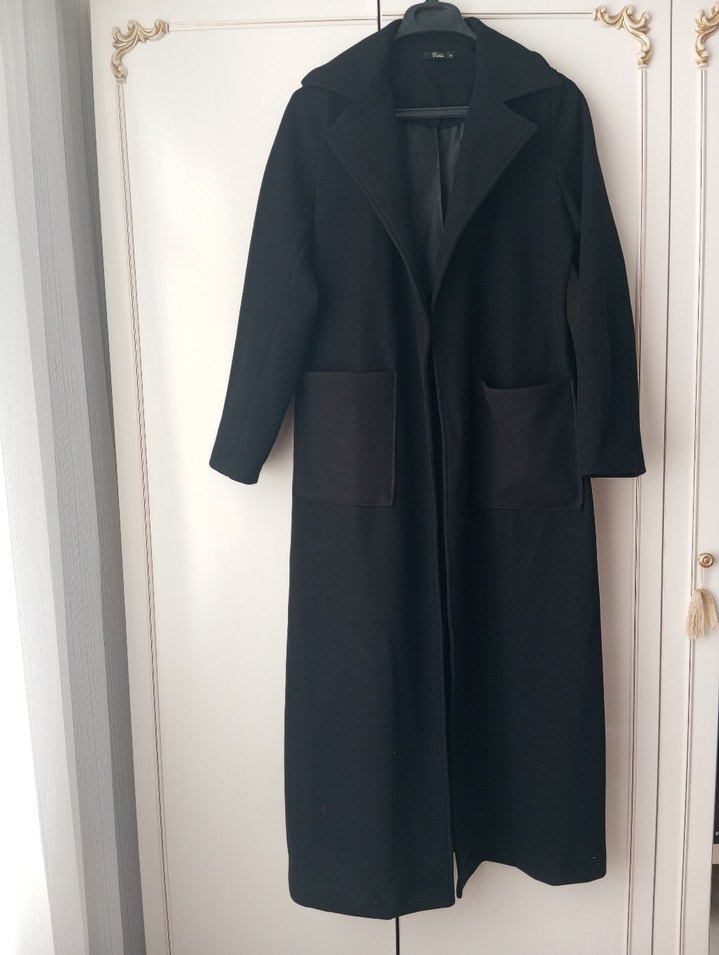 Uzun siyah kaban, klasik yaka ve büyük ön ceplerle tasarlanmıştır. Sade ve şık görünümüyle serin havalar için uygundur. s beden fakat m..l..Xl bedene de olur marka tesilli