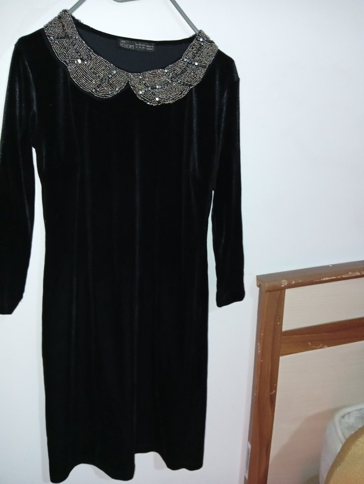 Uzun siyah kadife, dantel yakalı, uzun kollu, ince işlemeli ve payet detaylı klasik şık elbise. Ofis için uygundur.