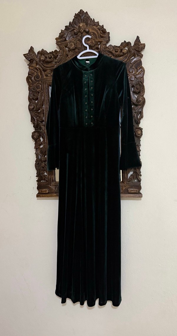 Uzun siyah kadife elbise, çentikli yaka, uzun kollu ve nakışlı detaylara sahip, ofis için uygun klasik gotik şıklık sunar.