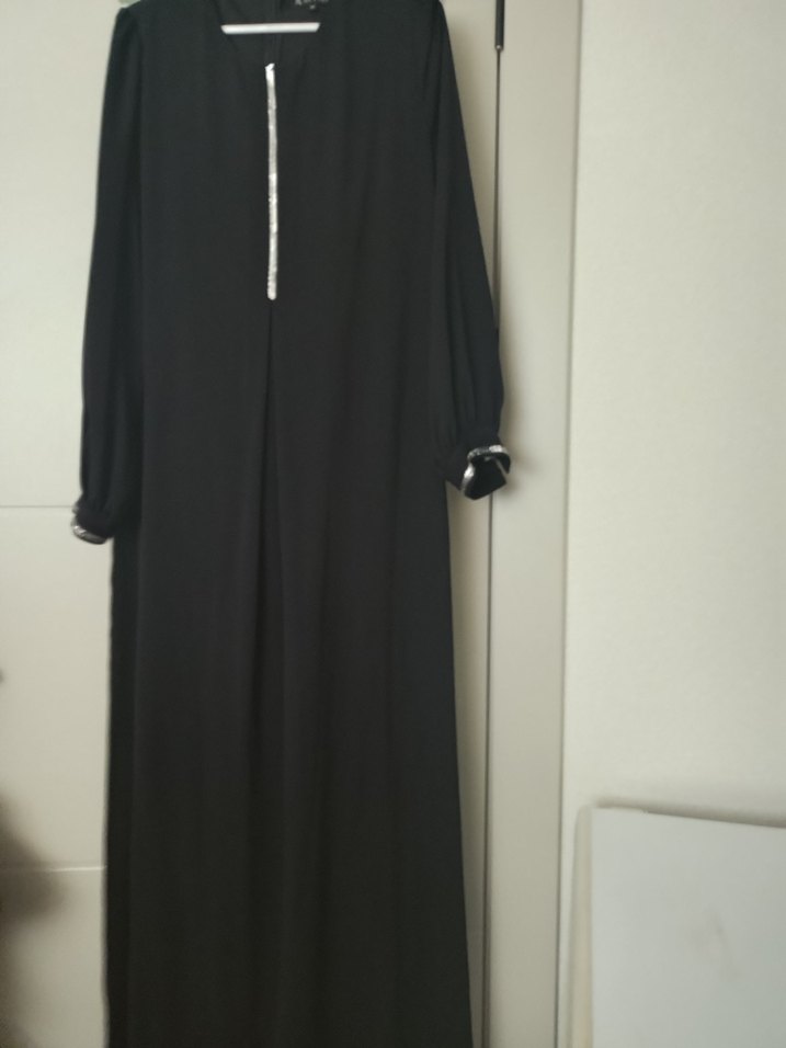 Uzun siyah elbise, salaş kesim, uzun kollu ve yüksek yakalıdır. abi'ye elbise sadece bıkere giyildi