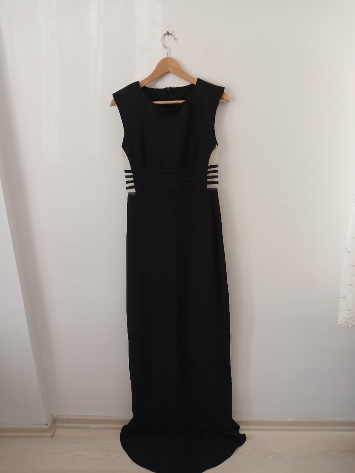 Uzun siyah abiye elbise, tek parça oturan kesim ve tekne yaka ile tasarlanmıştır. Minimalist gotik stil, yanlarda askılı detaylar ve drapeli şıklık sunar. Tul bolumunde kucuk bir deformasyon mevcuttir,fotograflarda belirtilmistir