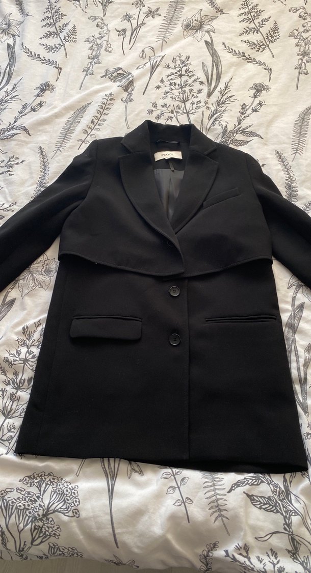 Kadınlar için düğmeli, yakalı ve uzun siyah blazer ceket. Sentetik kumaştan, ofis için uygun, goth tarzında ve düzenli kesim.