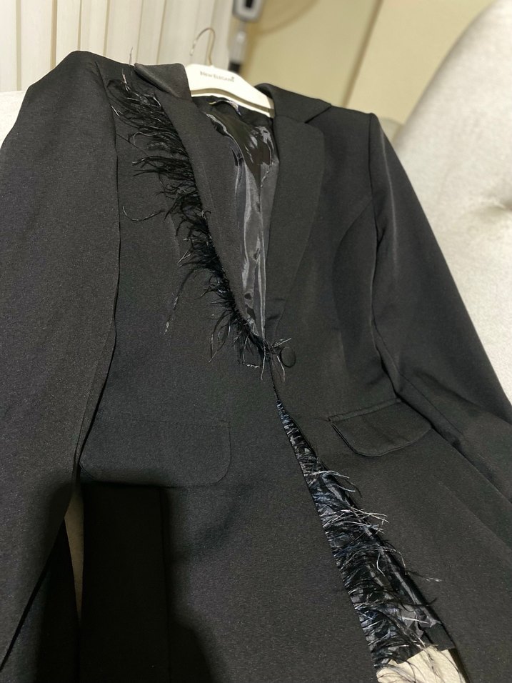 Sentikli yakalı, yırtmaçlı uzun siyah kadın blazer. Sentetik kumaştan, regular fit ve askılı kollu. Ofis için uygun, gotik ve avangard tarzda.