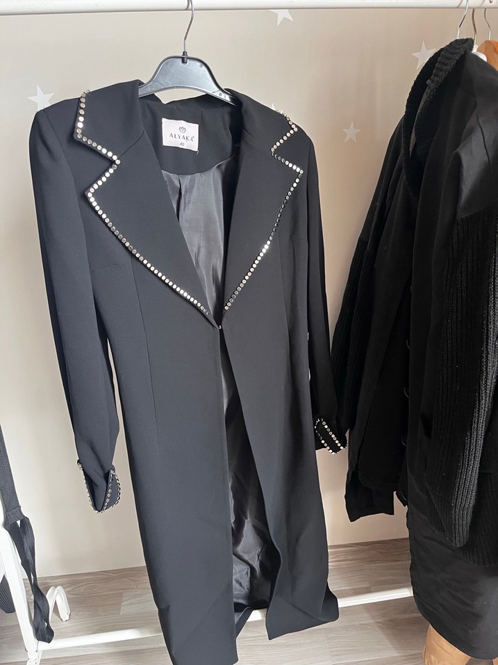 Siyah uzun kesim, düğmeli ve nakış detaylı kadın blazer. İpeksi kumaştan, uzun kollu ve regular fit. Ofis için goth ve avant-garde tarzında.
