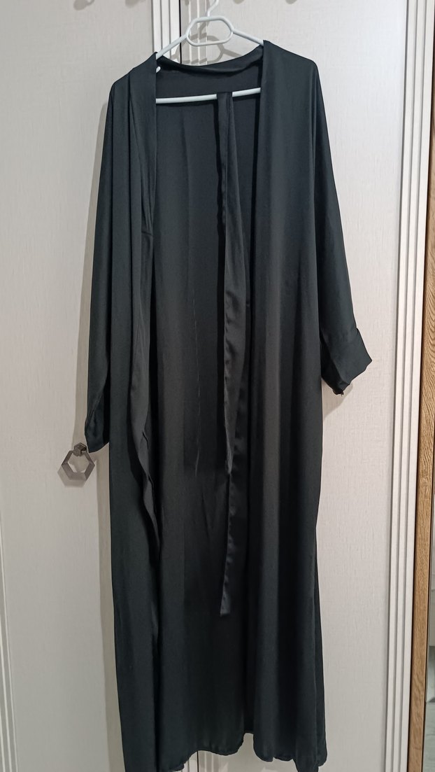 Uzun siyah kadın bornoz, bol kesim ve uzun kolludur. Minimalist gotik stilinde, desensiz sade bir tasarıma sahiptir.