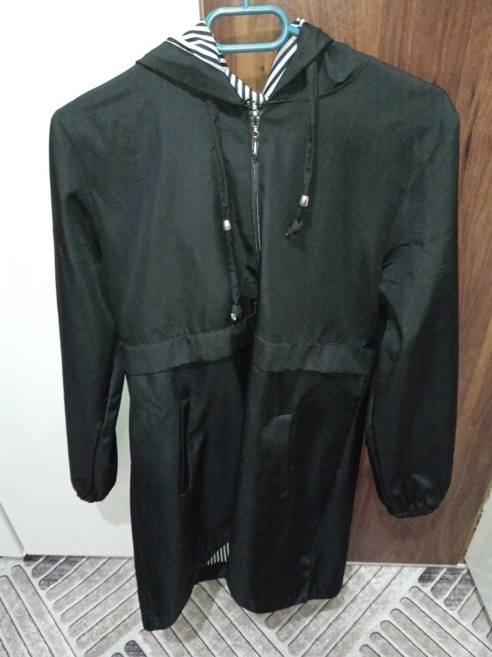 Uzun siyah kadın ceket, kapüşonlu ve fermuarlı, bol kesim ve uzun kolludur. Çizgili astarlı kapüşon ve notched lapel yaka detaylarına sahiptir.