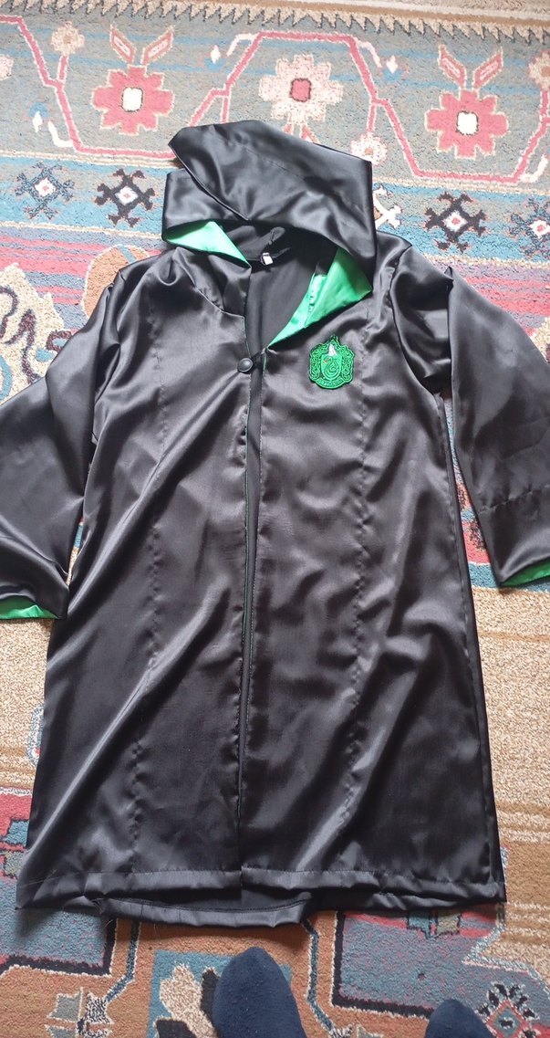 Uzun, bol kesim kadın cübbesi koyu yeşil astar ve kapüşonlu, parlak ve pürüzsüz kumaştan gotik tarzda. Uzun kollu ve göğüste yeşil amblem bulunur.