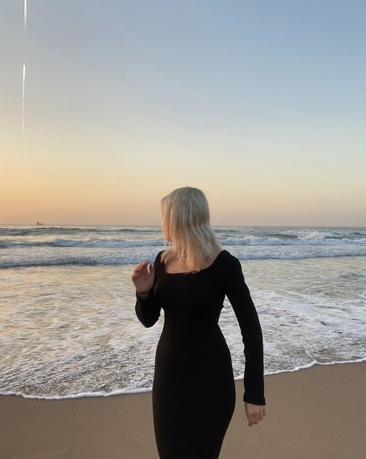 Uzun, siyah ve vücuda oturan bu elbise uzun kollu ve düz yakalıdır. İpek gibi dokusuyla detaylar ve minimalist goth tarzı sunar