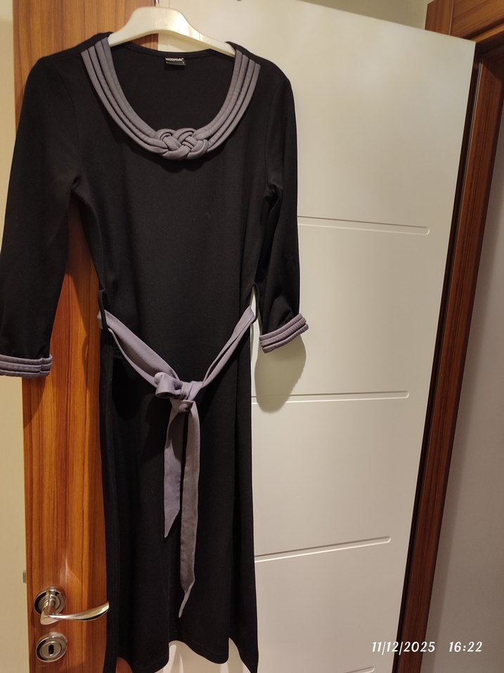 Uzun siyah elbise, yarım kollu, gri süslemeli yaka ve kemer ile düzenli kesime sahiptir. Desensiz ve sade tasarım sunar. 36/38