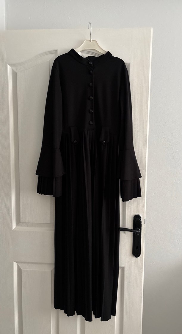 Bu uzun siyah elbise, bol kesim, pileli uzun kollu ve yakalıdır. Sentetik kumaştan yapılmıştır, günlük kullanım için uygundur.