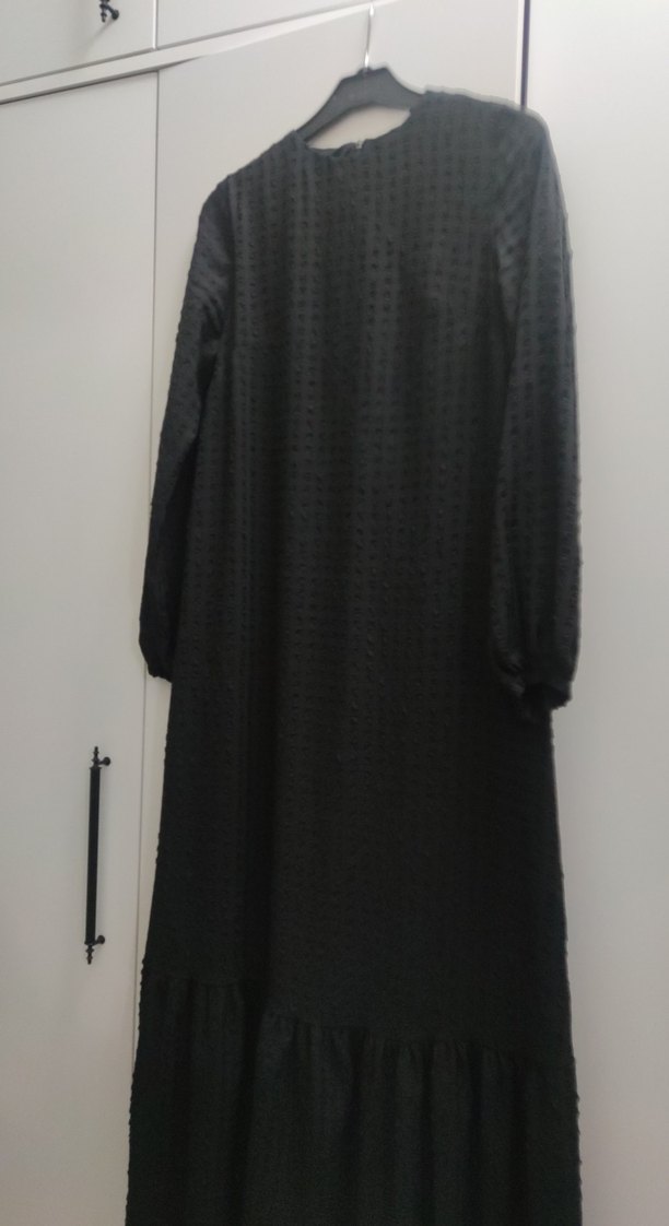 Uzun, siyah, uzun kollu ve bisiklet yaka kadın elbisesidir. Sentetik kumaştan, bol kesim ve drapeli tasarıma sahiptir. Günlük kullanıma uygundur. boy132 en44 cmdir astarlı dir