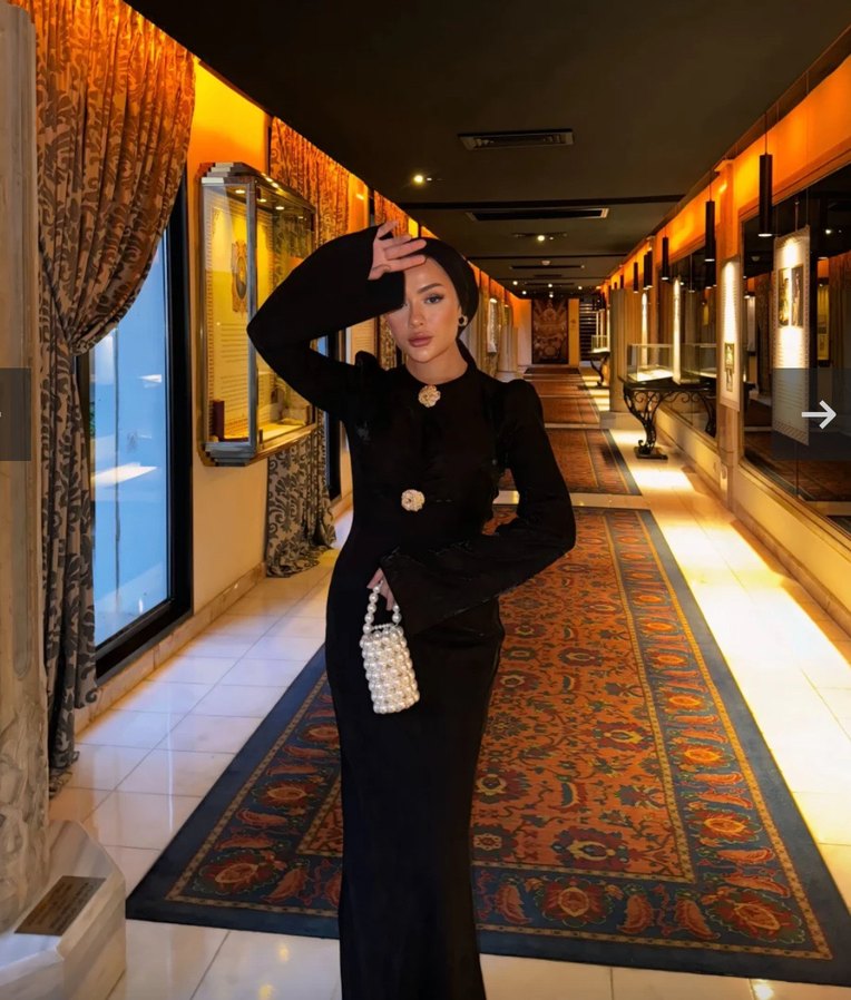 Uzun siyah kadın elbisesi, kesik yaka ve uzun kolludur. Dökümlü kumaş