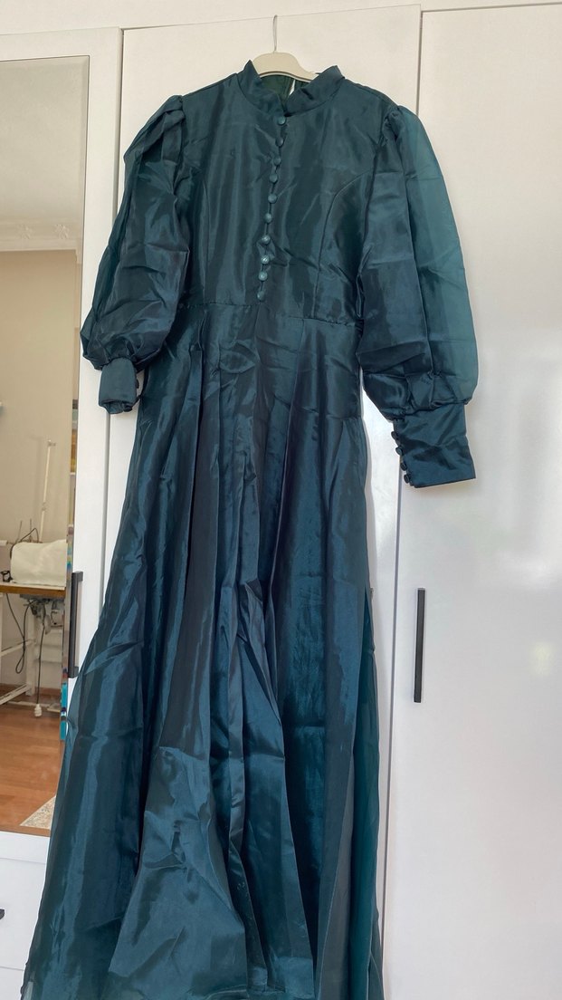Uzun siyah kadın elbise, yüksek yakalı ve uzun kolludur. İpek gibi dokusu ve dökümlü tasarımıyla ofis için uygundur, gotik tarzda şık bir seçimdir. Şal kemer dahi
