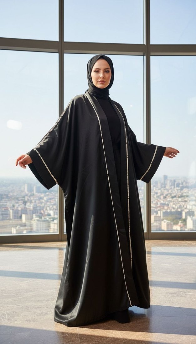 Uzun boy, siyah kadın elbisesi, etnik parlak desenlere ve uzun kollara sahip, minimalist ve şık bir görünüme sahiptir.
