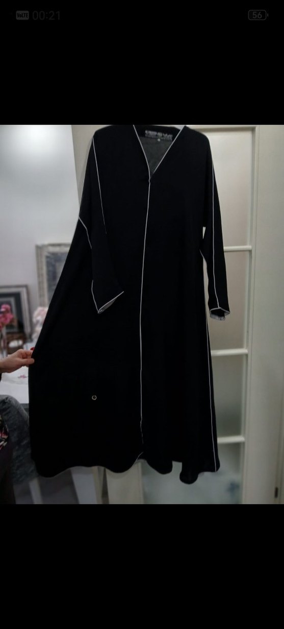Uzun siyah kaban, kesik yaka ve uzun kollu. İpek gibi kumaştan, normal kesim ve yırtmaçlı. Minimalist gotik tarzda, sade ve günlük kullanıma uygun.