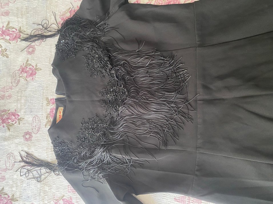 Uzun siyah gece elbisesi, kürk detayları ve nakışlı desenlere sahip. Kayık yaka, uzun kol ve vücuda oturan kesimle avant-garde tarzını yansıtıyor.