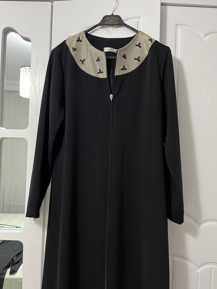 Uzun siyah kadın kaban, yakalı ve işlemeli detaylı, uzun kollu ve fermuarlı ön kısmıyla dikkat çeker. Gevşek kesimli, ipeksi kumaştan, mütevazı ve minimalist goth tarzında, günlük kullanım için uygundur.