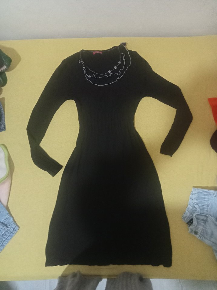 Fitted kesim uzun siyah triko elbise, yakasında drapeli detay ve uzun kolludur. Yumuşak ve sıcak kumaştan, gotik tarzda.