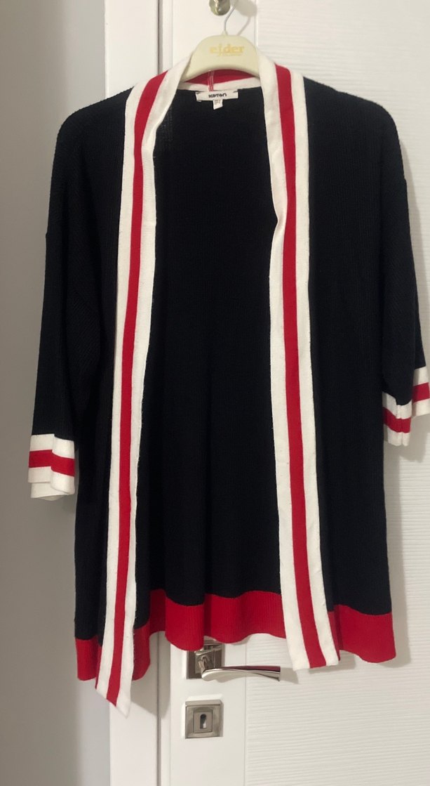 Uzun siyah kadın hırka, pilili detaylar ve çentikli yaka ile. Uzun kollu, bol kesim, kenar ve manşetlerde kırmızı-beyaz çizgili detaylar bulunur.