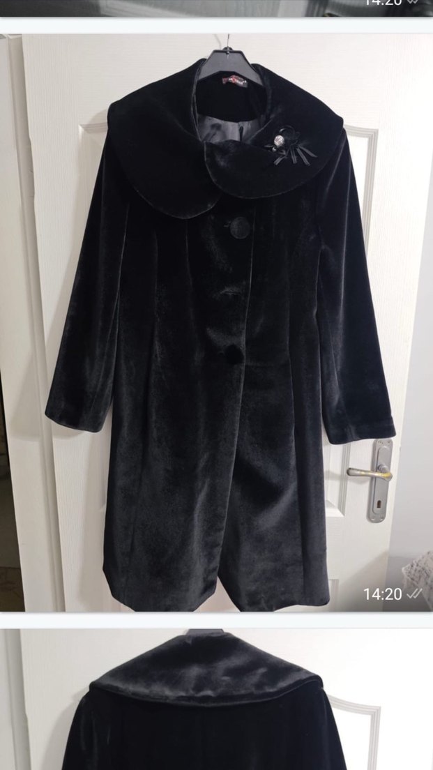 Uzun siyah kadın kaban, yakasında kürk detayları ve kesimli yaka ile klasik şıklık sunar. Ofis kullanımı için uygun, uzun kollu ve rahat kesimdir.
