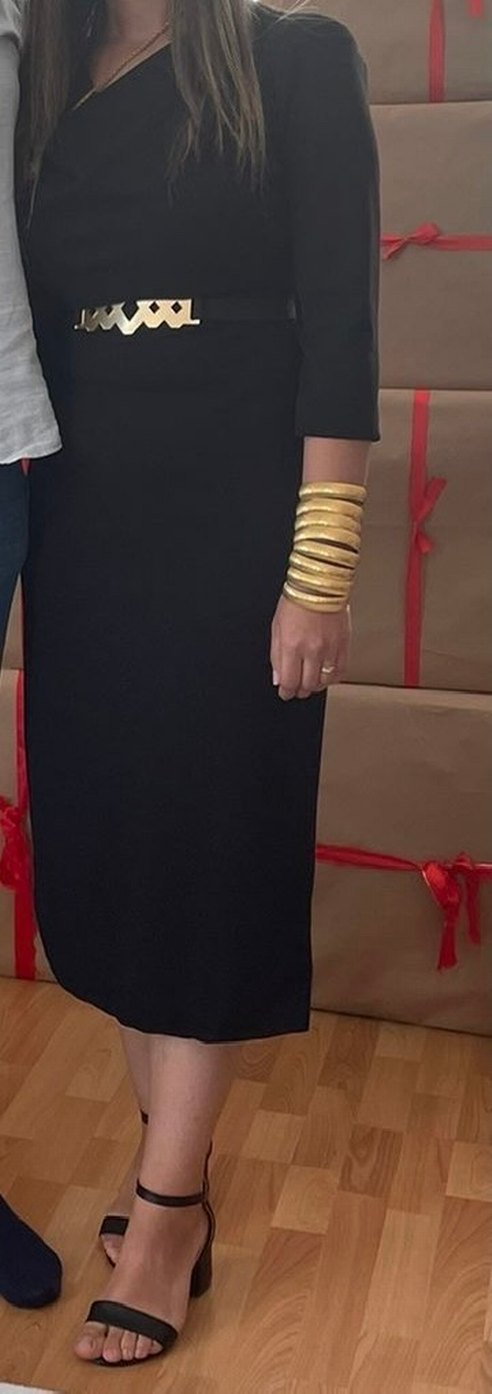 Uzun, vücuda oturan kadın kalem elbise, tek renk siyah ve kayık yaka ile ince askılıdır. İpek gibi kumaştan, elastik detaylıdır. Avant-garde sokak stili ve romantik akşamlar için uygundur.