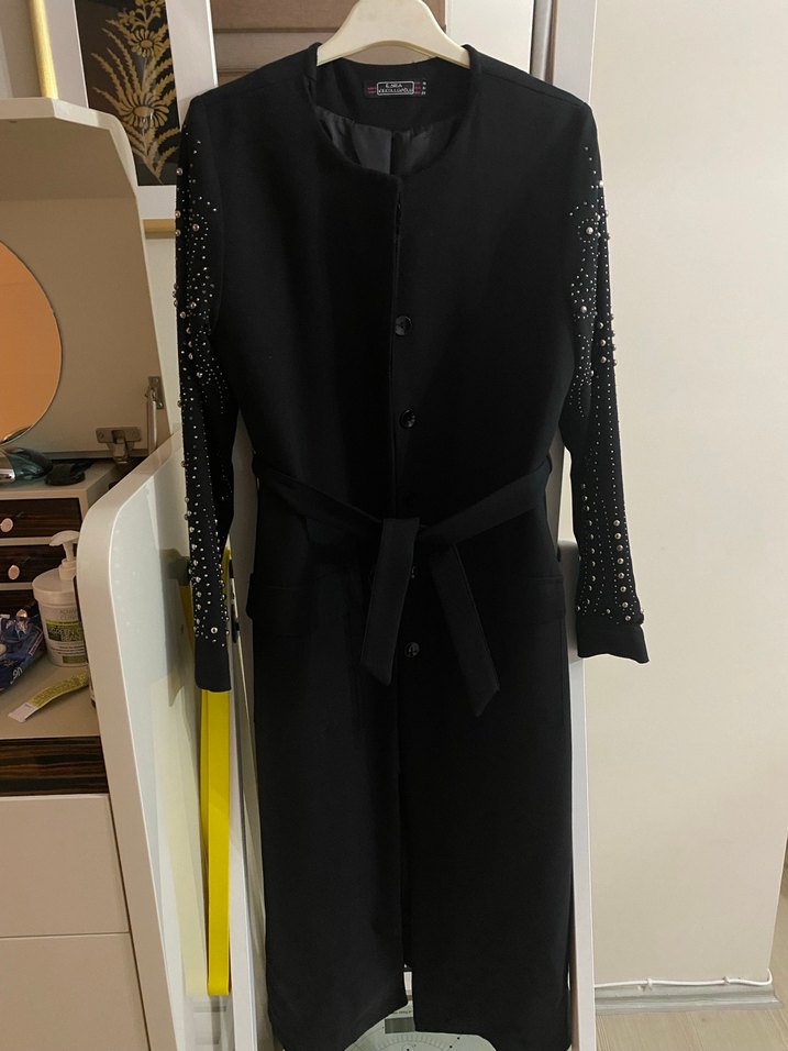 Uzun siyah kaban, kemerli ve kolları hafif süslemeli, ipeksi dokuda, zımba detaylı