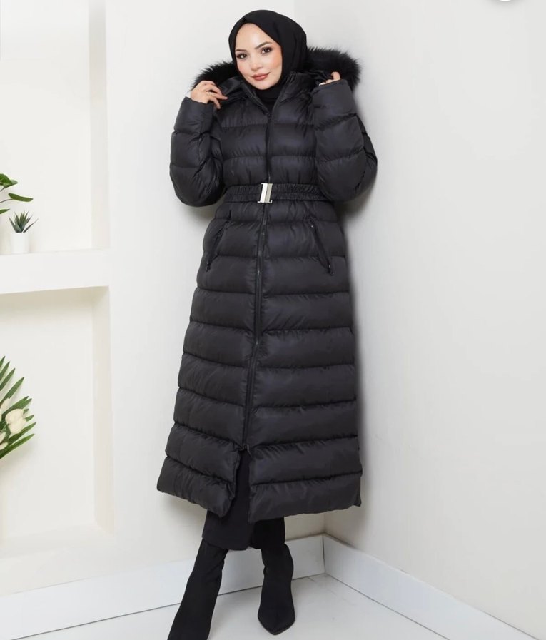 Uzun siyah kemerli kışlık mont, yüksek yakalı ve sentetik kumaştan üretilmiştir. Rahat kesimi ve askılı kollarıyla günlük sokak stiline uygundur.