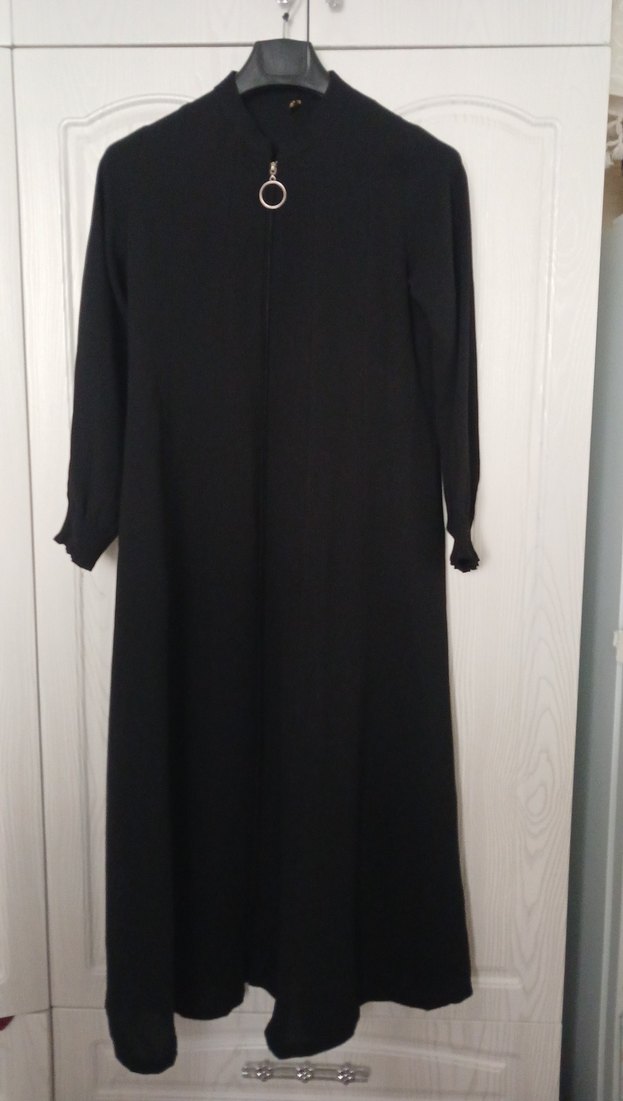 Uzun siyah ferace, yüksek yakalı ve dökümlü tasarıma sahip. Düz, sentetik kumaştan üretilmiş, uzun kollu ve sade goth tarzında, ofis için uygun. OMUZLARI VATKALIDIR.